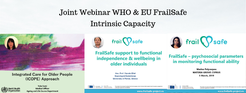 On 5 March, FrailSafe organized a joint webinar with the WHO on “Intrinsic Capacities”. As Yuka Sumi, Medical Officer at the WHO’s Ageing and Life Course Department explained in her presentation, intrinsic capacity is the combination of individuals’ physical and mental capacities, whereas functional ability is the combination and interaction of intrinsic capacity with the environment a person inhabits. For example, a person has bad eyesight which is the intrinsic capacity, but with contract lenses or glasses, the functional ability for vision is fine.